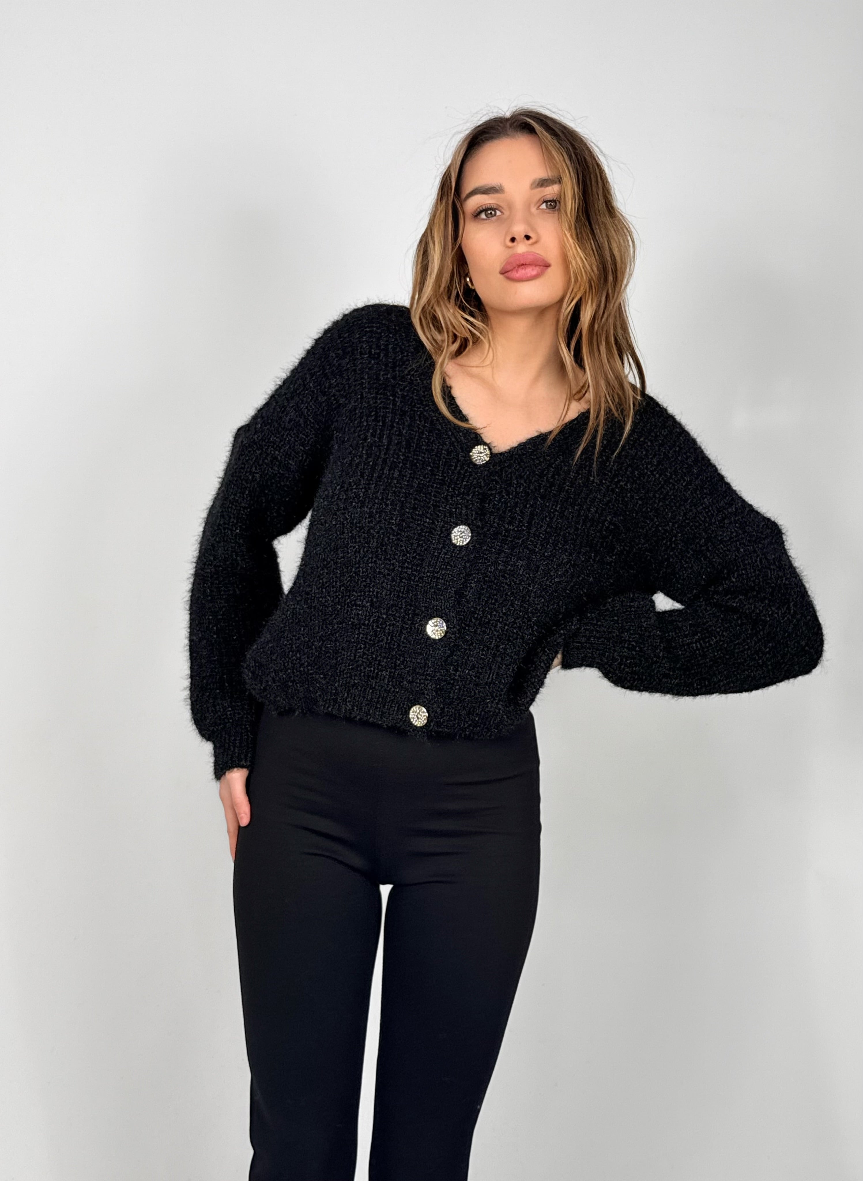 Cardigan in lana elasticizzato con bottoni veste da una tg Xs ad una XL con bottoni sul davanti.