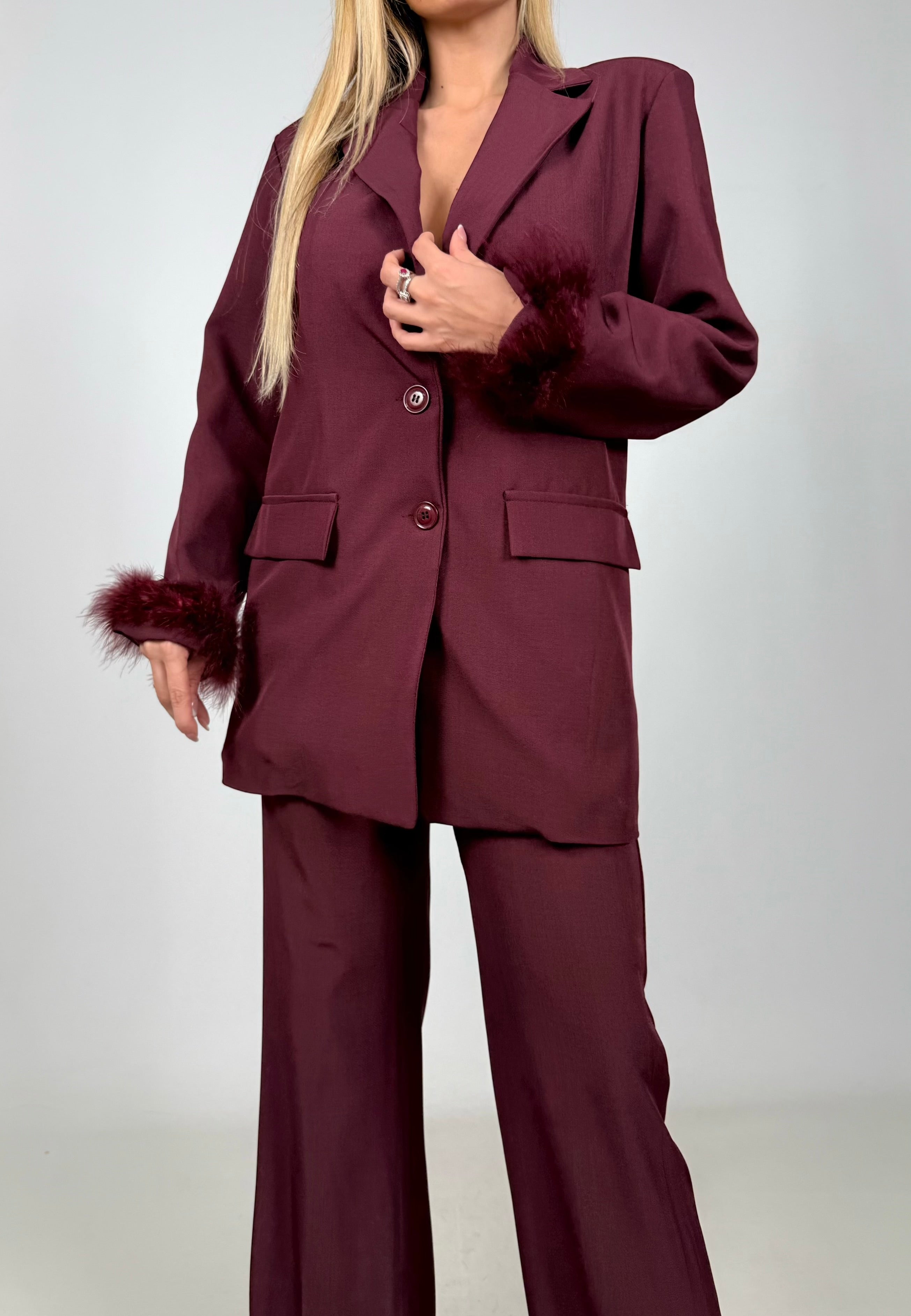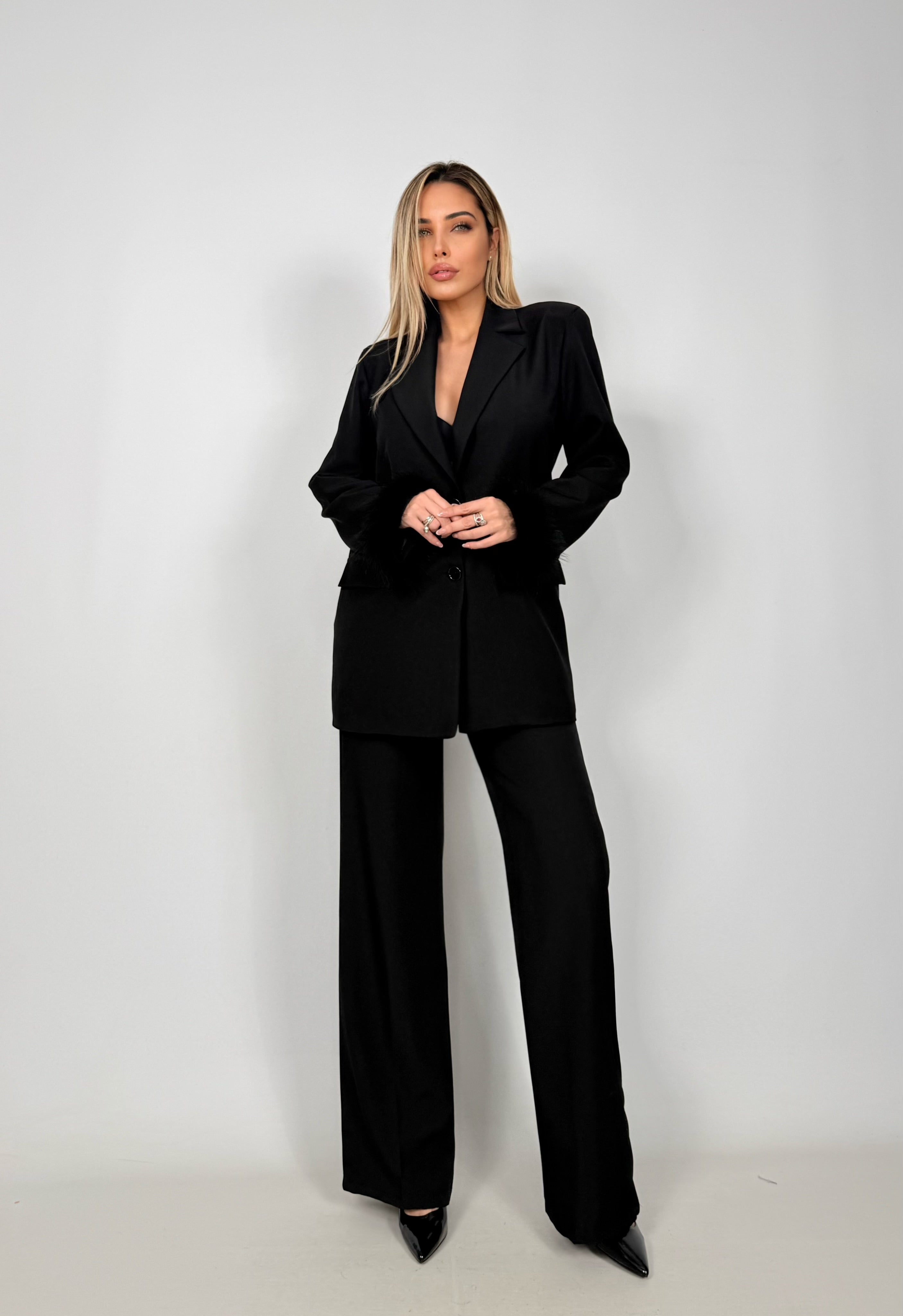 Coordinato composto da pantalone e giacca con manica in piume veste da una tg 38 ad una tg 44/46.